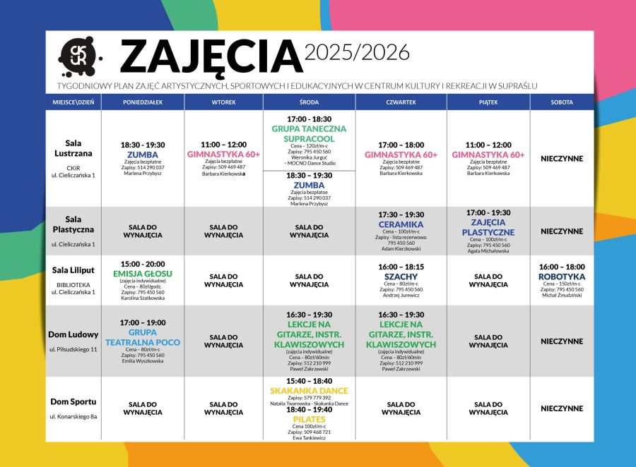 Uwaga!! Zmiana niektórych terminów i stawek, wszelkie informacje na plakatach, szczegółowych informacji udzielimy przy zapisach na zajęcia.