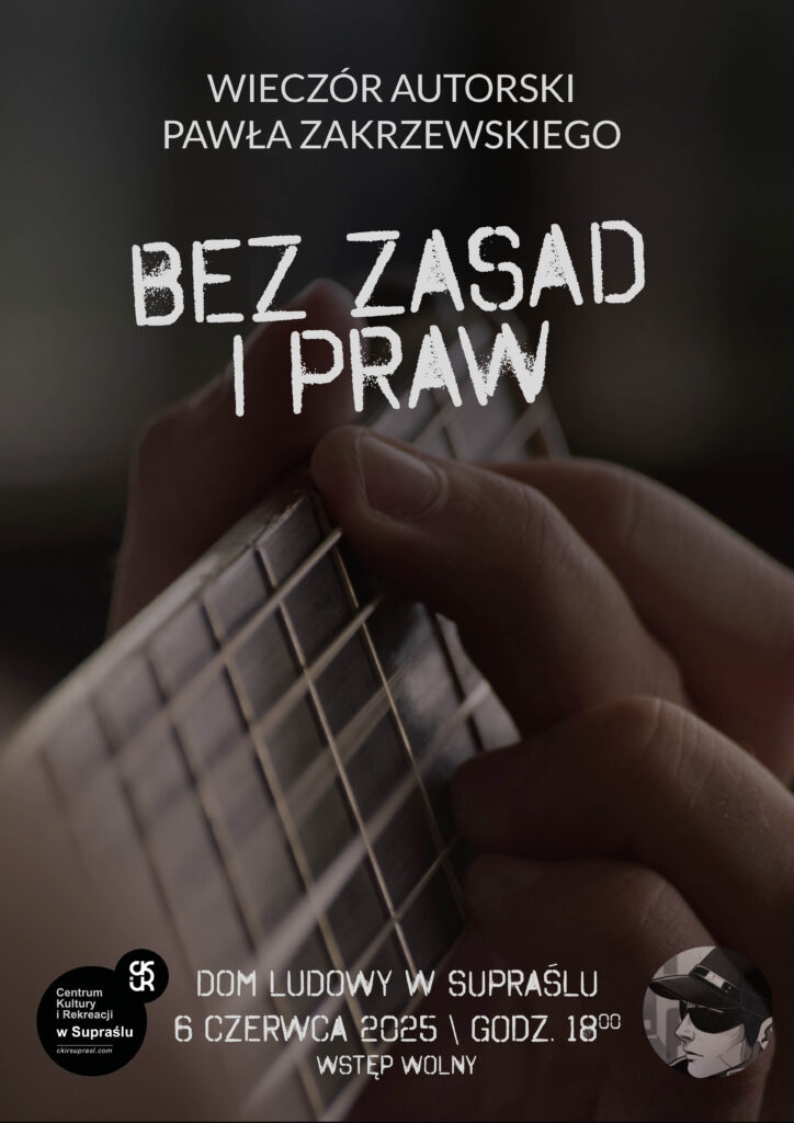 Bez Zasad i Praw - wieczór autorski Pawła Zakrzewskiego Napisane przez Paweł Zakrzewski w dniu 3 czerwca, 2025. Dni Kultury w Supraślu 5 czerwca, 2025 Kulinarne Kino – „Uczta Babette” 7 czerwca, 2025